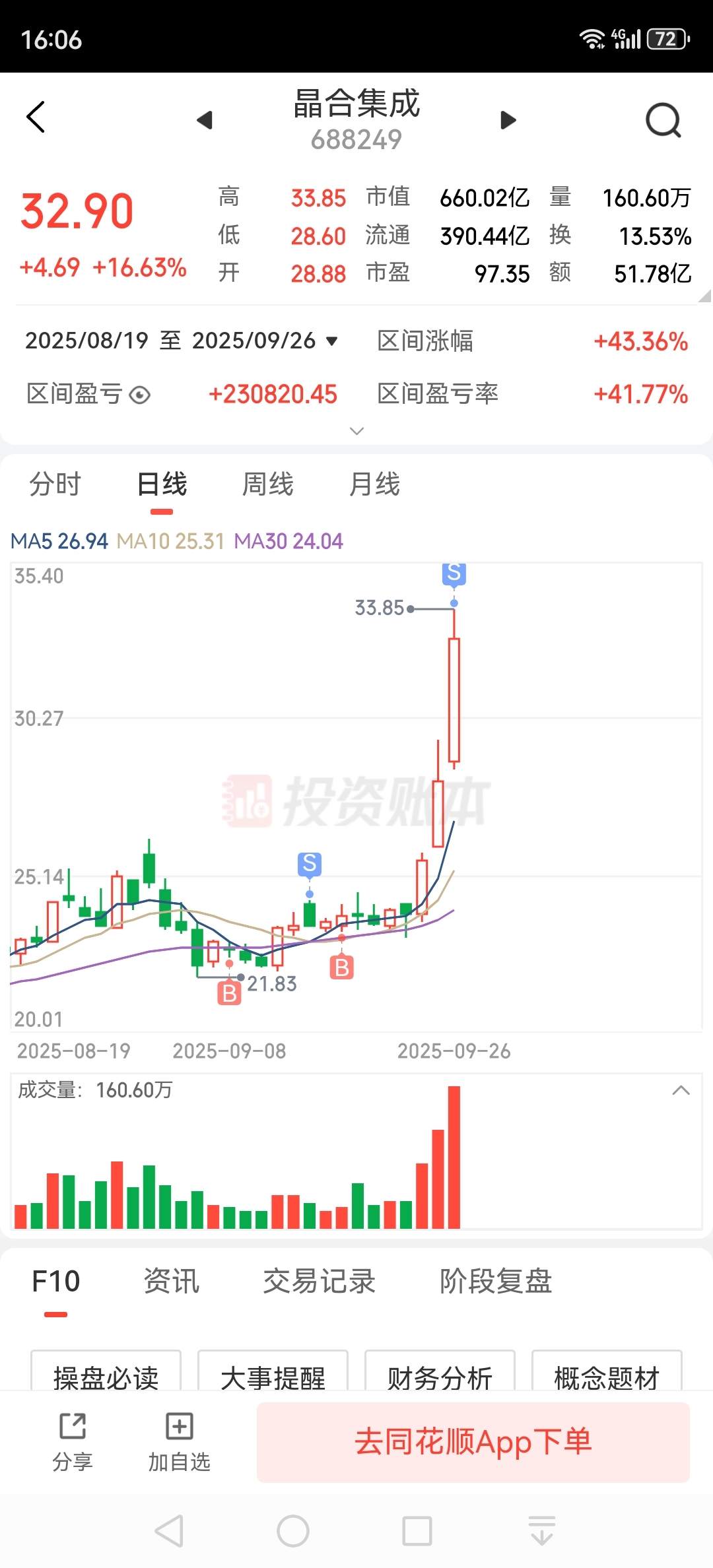$晶合集成(SH688249)$ 之前满仓这支票,今天二次上板后出了一半仓,新进了士兰微。另一半仓继续持股待涨,后期还有新高,技术上观察这波有可能到43左右,等有卖点才会清仓。