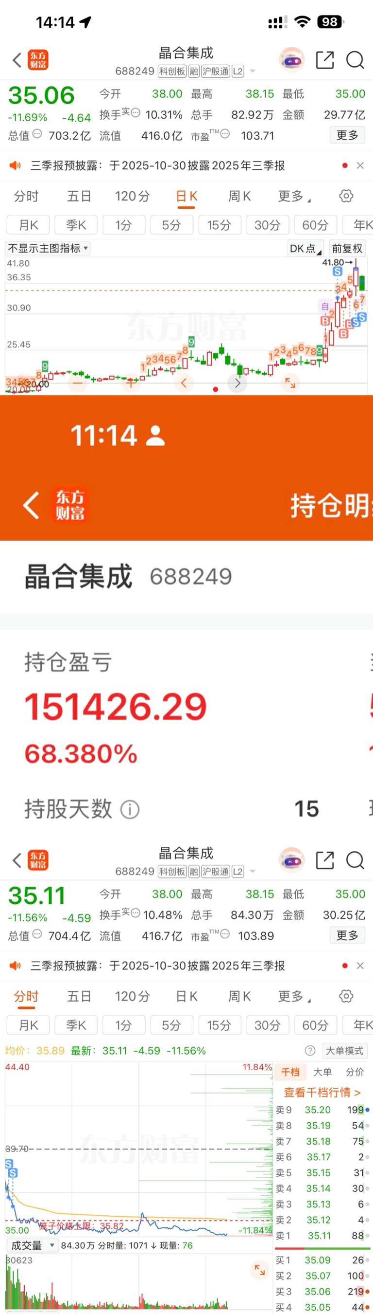 $晶合集成(SH688249)$ 9月24日开始买入,10月9日抛出,今天早上抛出最后1000股,操作结束,见好就收。6个交易日60%。