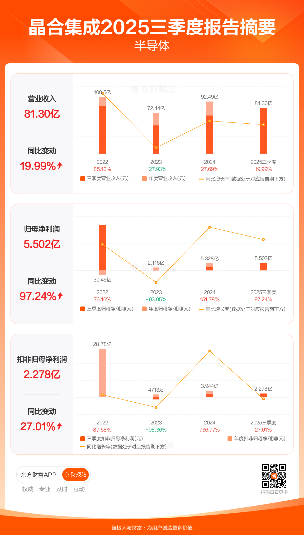 晶合集成10月30日发布2025年三季报显示,公司前三季实现营业收入81.30亿元,同比增长19.99%;归母净利润5.50亿元,同比增长97.24%;扣非归母净利润2.28亿元,同比增长27.01%。
