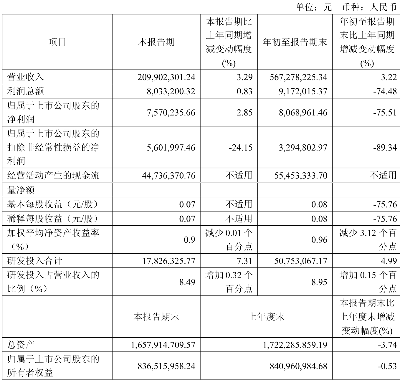 中证智能财讯井松智能(688251)10月30日披露2025年第三季度报告。前三季度公司实现营业总收入5.67亿元,同比增长3.22%;归母净利润806.9万元,同比下降75.51%;扣非净利润329.48万元,同比下降89.34%;经营活动产生的现金流量净额为5545.33万元,上年同期为-1.11亿元;报告期内,井松智能基本每股收益为0.08元,加权平均净资产收益率为0.96%。