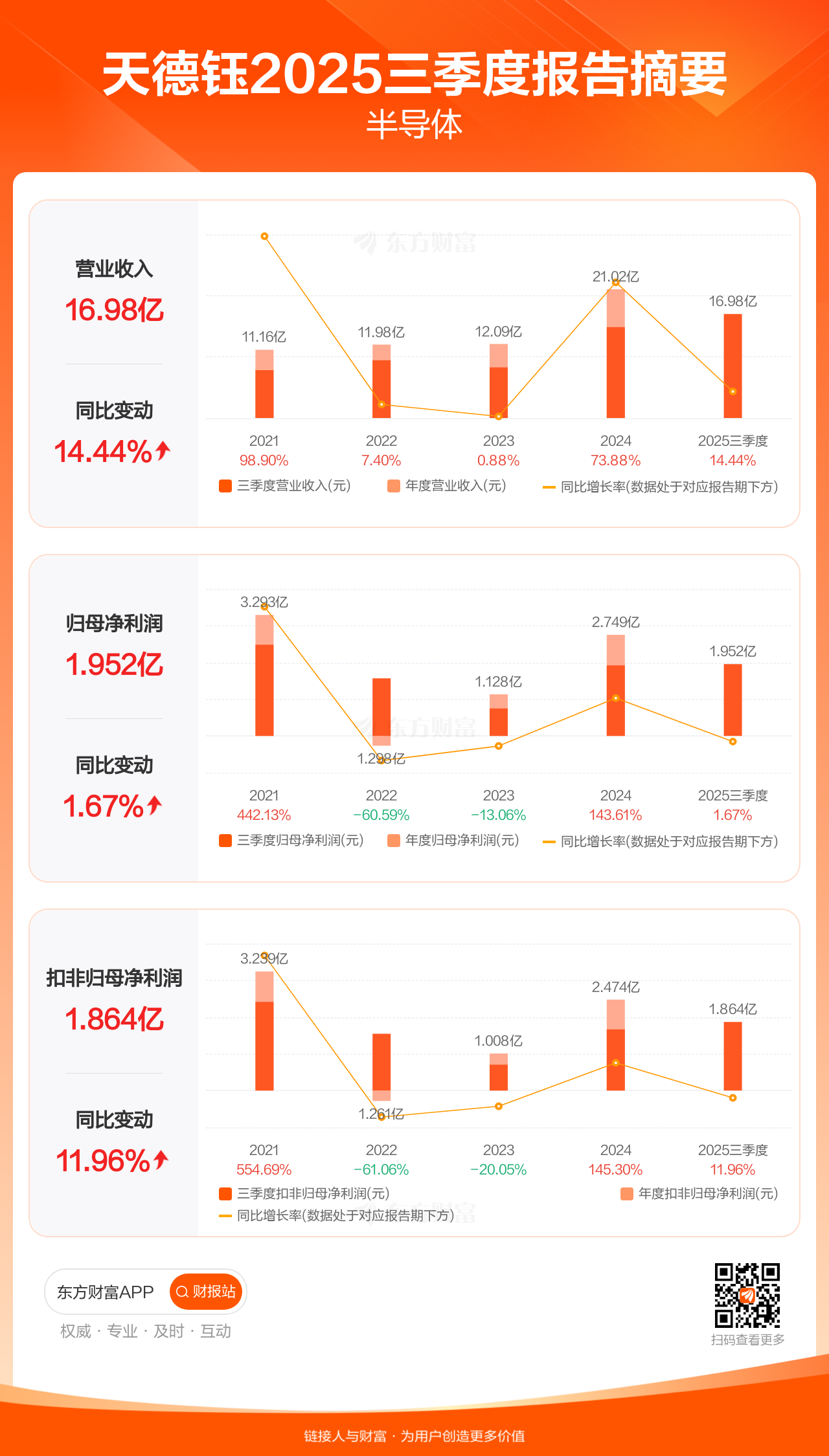 天德钰10月31日发布2025年三季报显示,公司前三季实现营业收入16.98亿元,同比增长14.44%;归母净利润1.95亿元,同比增长1.67%;扣非归母净利润1.86亿元,同比增长11.96%。