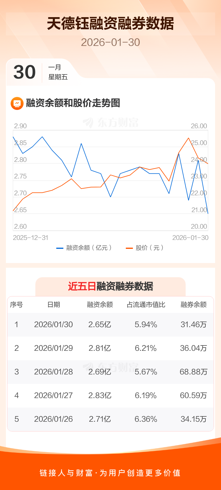 交易所最新数据显示,天德钰于2026年1月30日获融资买入2110.98万元,融资偿还3705.61万元,当日融资净偿还1594.64万元。目前,该股融资余额2.65亿,占流通市值比例为5.94%。
