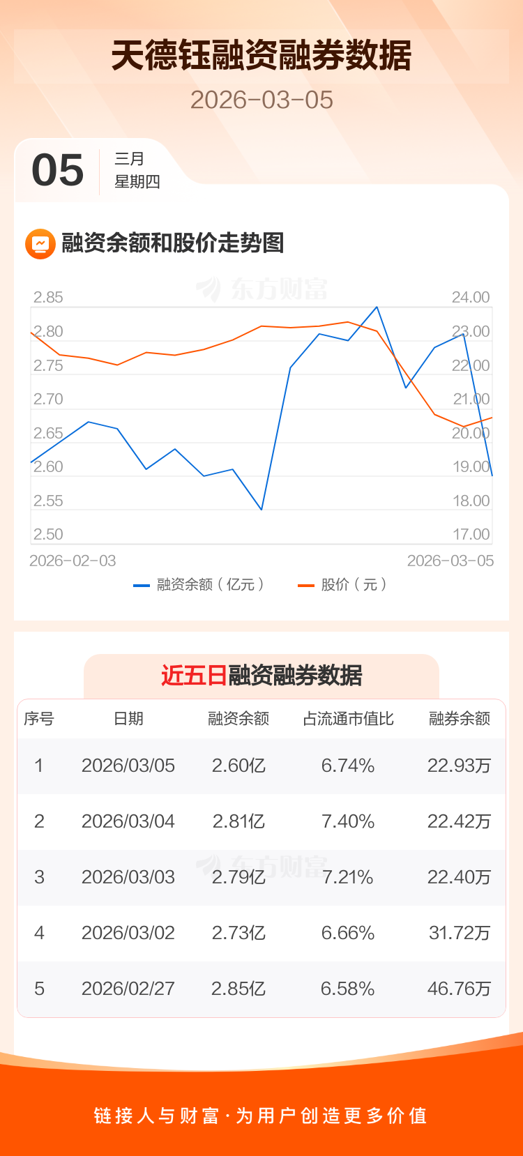 交易所最新数据显示,天德钰于2026年3月5日获融资买入815.06万元,融资偿还2970.29万元,当日融资净偿还2155.23万元。目前,该股融资余额2.60亿,占流通市值比例为6.74%。