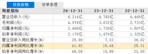 上市后的2022年~2024年,公司营收和净利一直保持双双增长的态势。这三年公司营收分别同比增长36.62%、7.03%、41.92%;归母净利润分别增长25.31%、15.44%、41.92%。