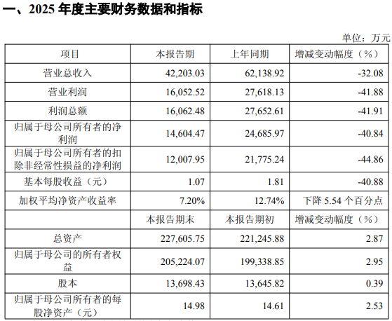 2月11日盘后,英诺特(688253)发布2025年度业绩快报,报告期内公司实现营业收入4.22亿元,同比下降32.08%;归母净利润1.46亿元,同比下降40.84%;基本每股收益1.07元,同比下降40.88%。