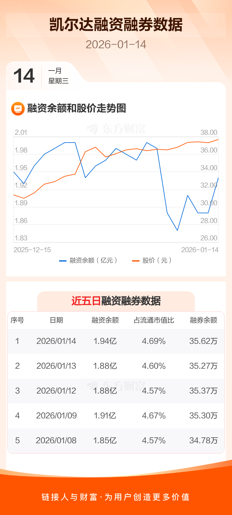 交易所最新数据显示,凯尔达于2026年1月14日获融资买入2212.47万元,融资偿还1652.20万元,当日融资净买入560.27万元。目前,该股融资余额1.94亿,占流通市值比例为4.69%。