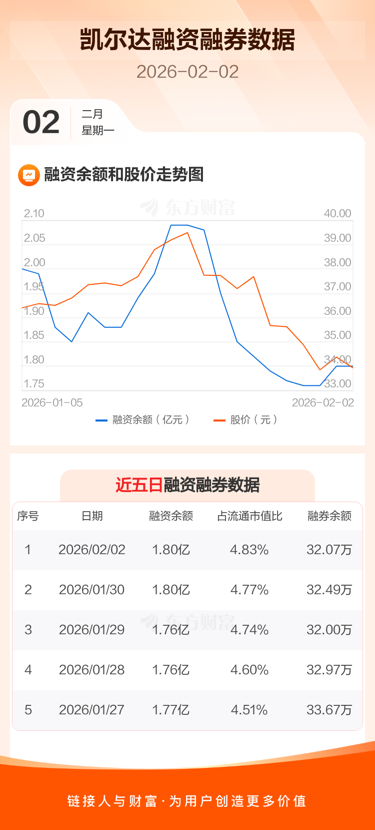 交易所最新数据显示,凯尔达于2026年2月2日获融资买入1208.26万元,融资偿还1212.08万元,当日融资净偿还3.83万元。目前,该股融资余额1.80亿,占流通市值比例为4.83%。