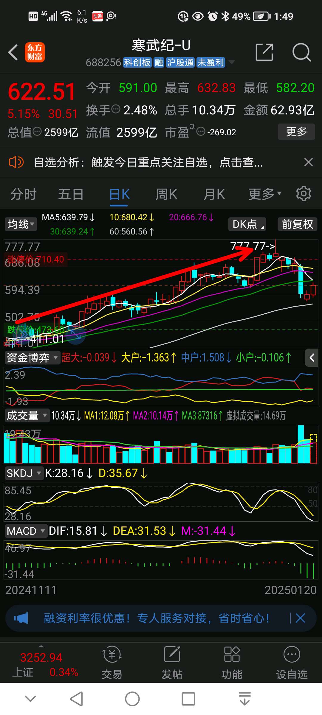 寒武纪—U趋势已经转弱,借着反抽,一旦到了压力位,就减仓,涨了十几倍,逢高兑现,
