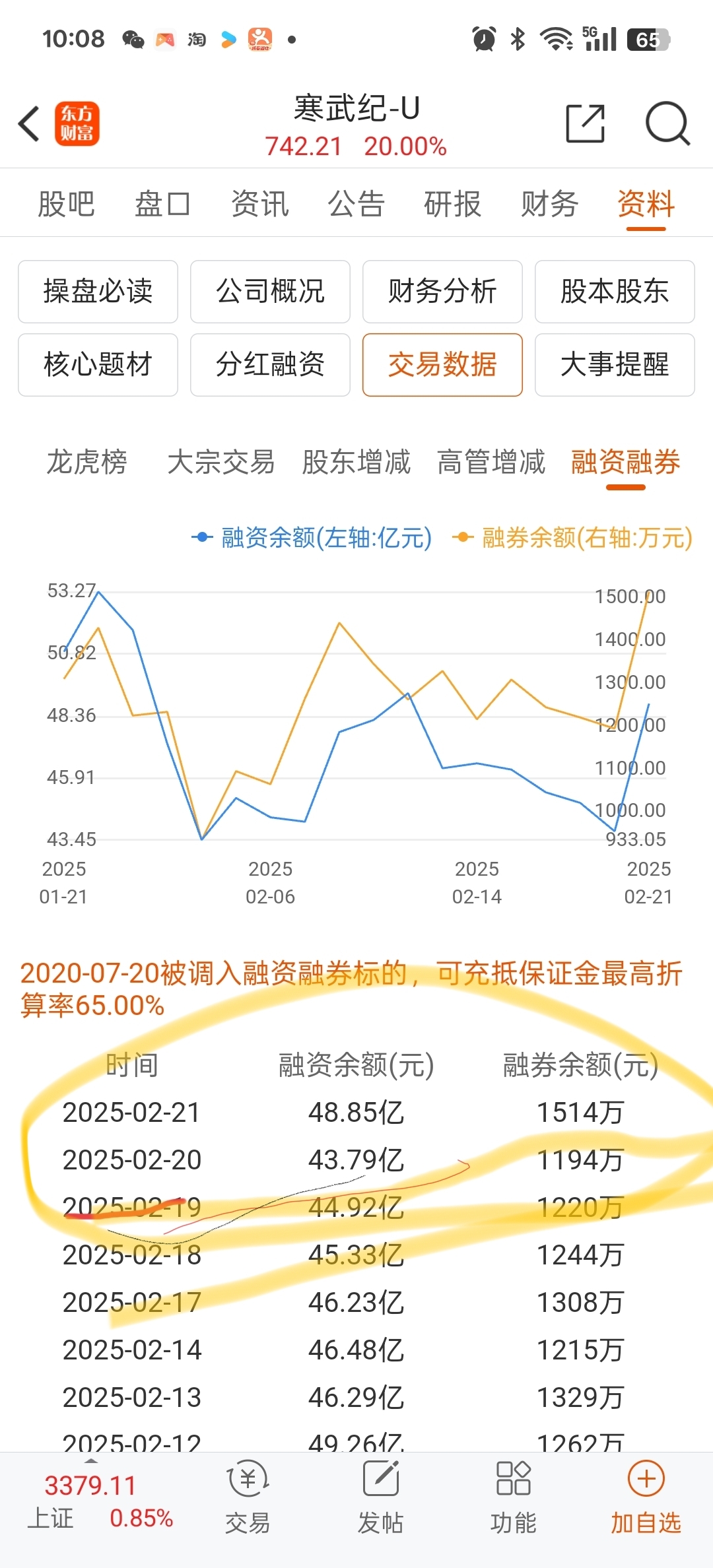 $寒武纪-U(SH688256)$ 融资金额在减少,融券在增加。