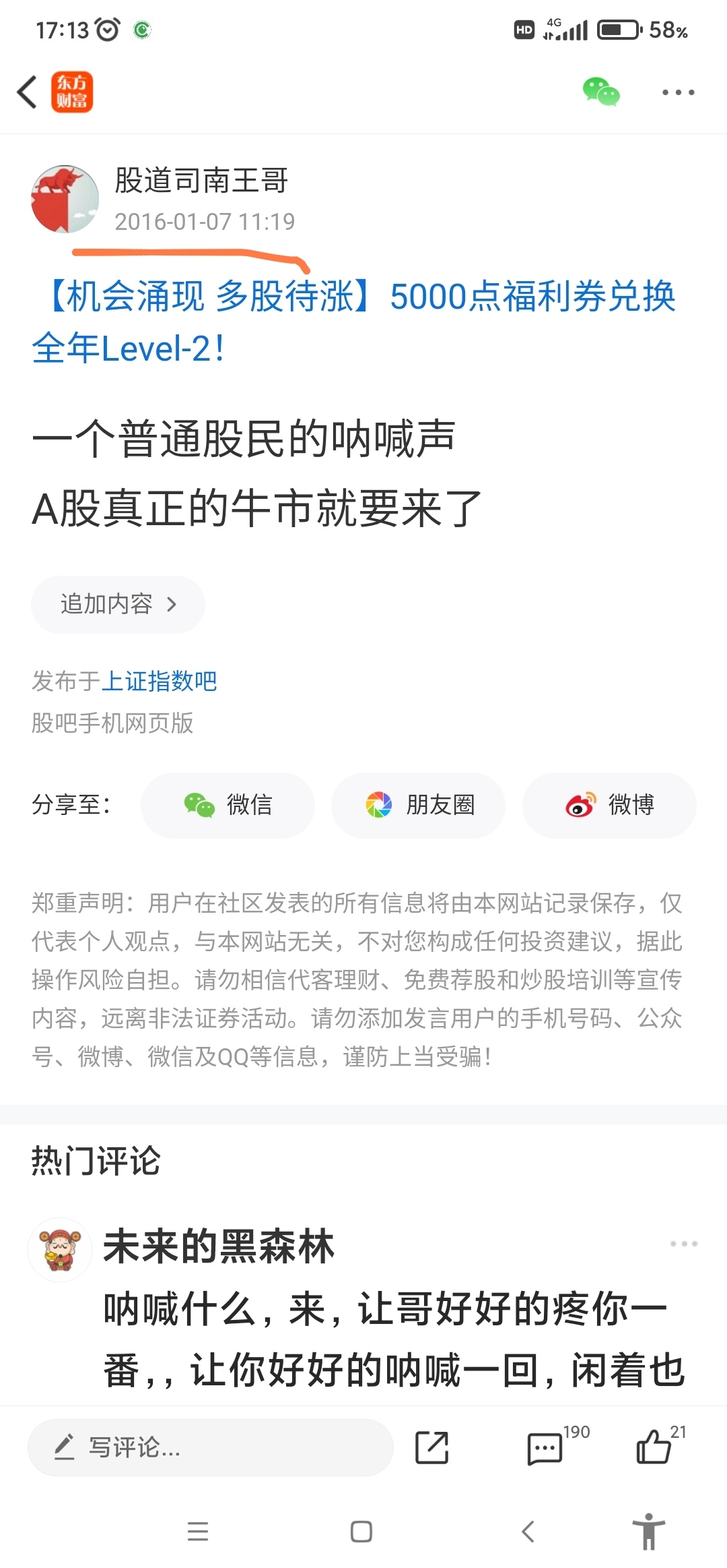 温馨提示: 1.根据《证券法》规定,禁止编造、传播虚假信息或者误导性信息,扰乱证券市场;2.用户在本社区发表的所有资料、言论等仅代表个人观点,与本网站立场无关,不对您构成任何投资建议。用户应基于自己的独立判断,自行决定证券投资并承担相应风险。《东方财富社区管理规定》