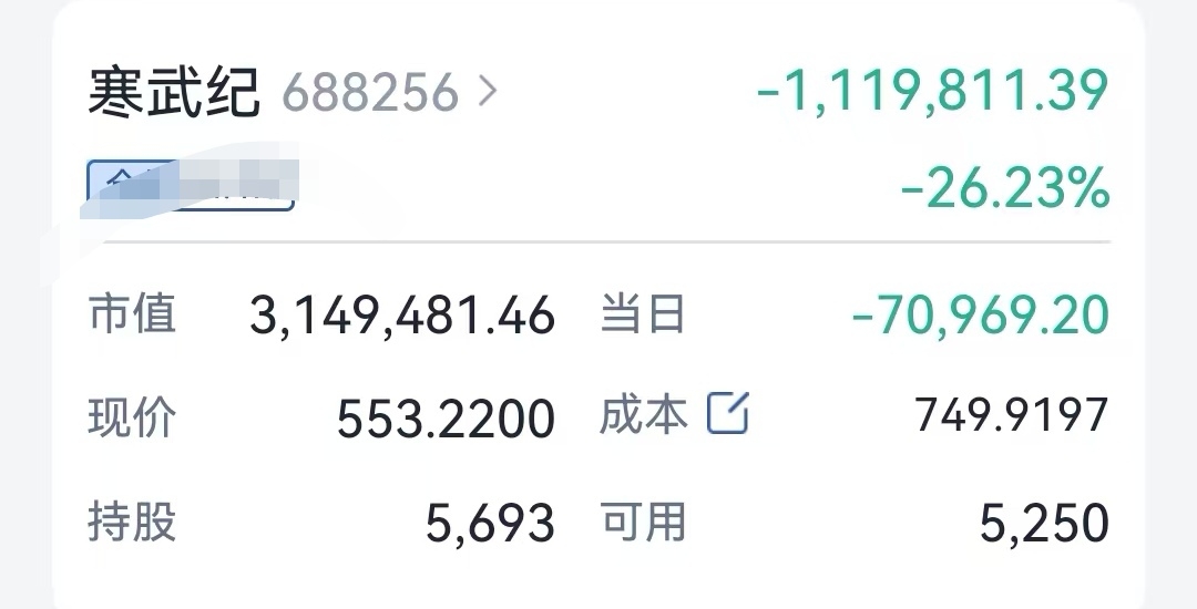$寒武纪-U(SH688256)$ 7月15号寒武纪接近最低点时,我硬抗几个月,这个过程太黑暗了,导致主升浪时我一边减仓一边做T,收益损失巨大!这个过程吃了很多亏,但好在我没有放弃坚持过来了!9月份寒武纪没有跟上中芯和海光,我也是亏损了50w,节后希望能回本!