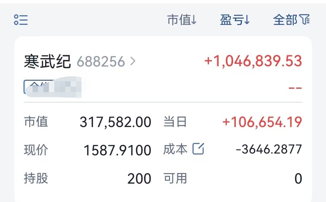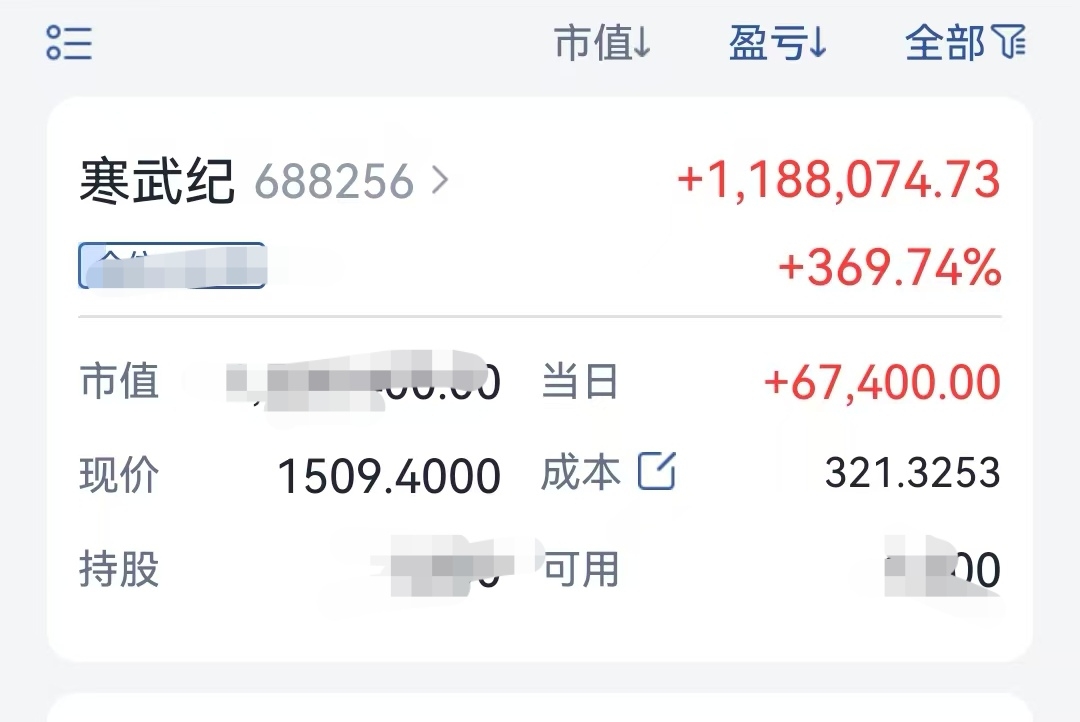 $寒武纪-U(SH688256)$ 7月15号寒武纪接近最低点时,我硬抗几个月,这个过程太黑暗了,导致主升浪时我一边减仓一边做T,收益损失巨大!这个过程吃了很多亏,但好在我没有放弃坚持过来了!9月份寒武纪没有跟上中芯和海光,我也是亏损了50w,节后希望能回本!现在成本1000+我也曾自我怀疑,多次机会给了1500没走,我也思考过上行空间大还是下跌空间大?