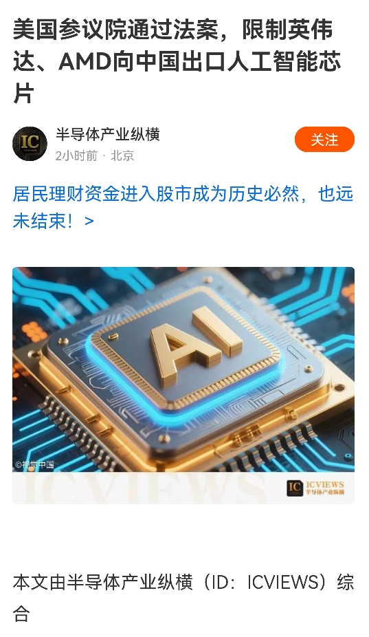 美国参议院通过法案,限制英伟达、AMD向中国出口人工智能芯片国产替代,下周寒武纪
