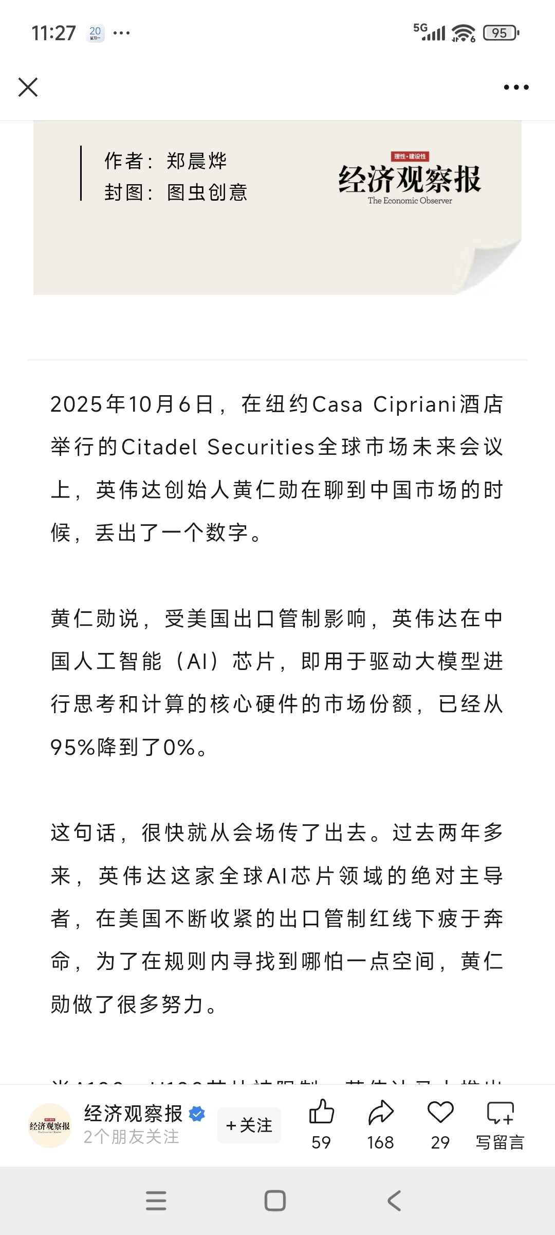 黄仁勋说,受美国出口管制影响,英伟达在中国人工智能(AI)芯片,即用于驱动大模型进行思考和计算的核心硬件的市场份额,已经从95%降到了0%