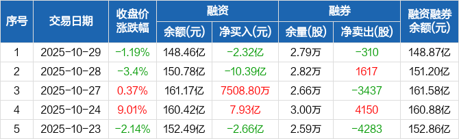 寒武纪:融资净偿还2.32亿元,两市排名第八(10-29)