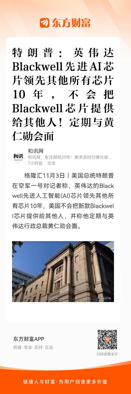 格隆汇11月3日|美国总统特朗普在空军一号对记者称,英伟达的Blackwell先进人工智能(AI)芯片领先其他所有芯片10年,美国不会把新款Blackwell芯片提供给其他人,并称他定期与英伟达行政总裁黄仁勋会面。