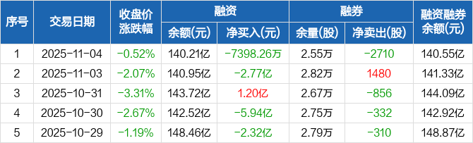 寒武纪:融资净偿还7398.26万元,融资余额140.21亿元(11-04)
