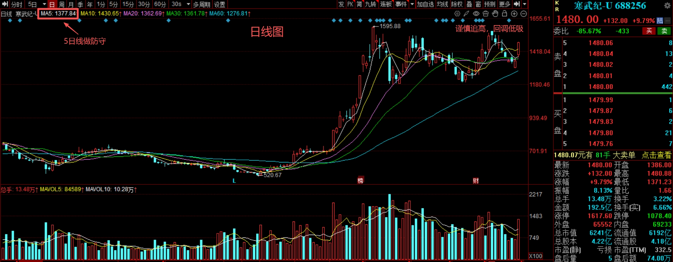 寒王今日大涨近10%站上5日线,股价重回短期强势区间。当前关键观察5日线(1377.84元)支撑力度,若能企稳则有望挑战前高1560元;若失守5日线则可能下探1350元附近支撑,进一步跌破或将考验1300元整数关口。尽管三季报表现亮眼,但市盈率仍高达332倍,建议持仓者以5日线为防守位,未入场者谨慎追高,可等待更佳介入时机。