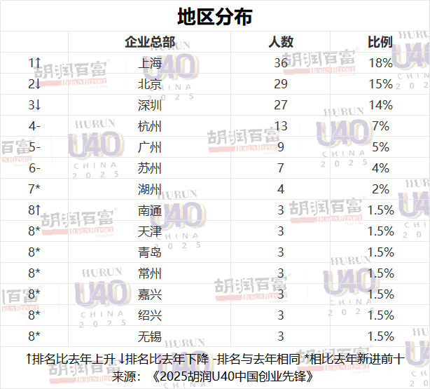 他称,U40创业先锋的城市分布,反映了各地创业生态的成熟度——集聚度越高的城市,往往也孕育着更多具备快速增长潜力的企业。今年上榜创业者来自53个城市,包括海外的新加坡和旧金山。而上海、北京、深圳、杭州、广州是最受U40创业者青睐的城市。其中深圳上榜人数为37人,占比14%。