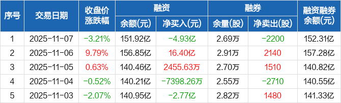 寒武纪:融资净偿还4.93亿元,融资余额151.92亿元(11-07)
