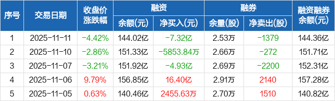 寒武纪:融资净偿还7.32亿元,两市排名第一(11-11)