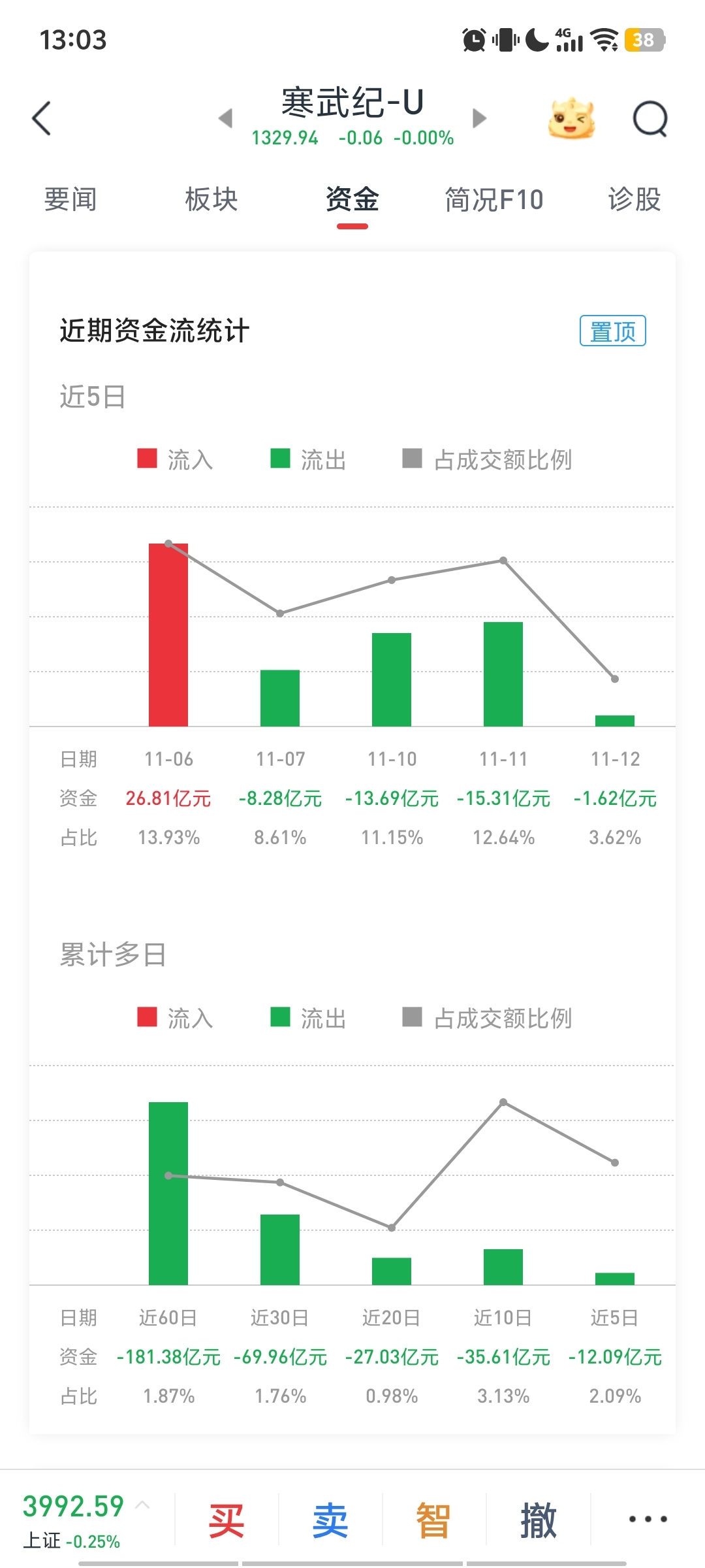 $寒武纪-U(SH688256)$ 资金流出已经快见底了,没有量了,快起来了