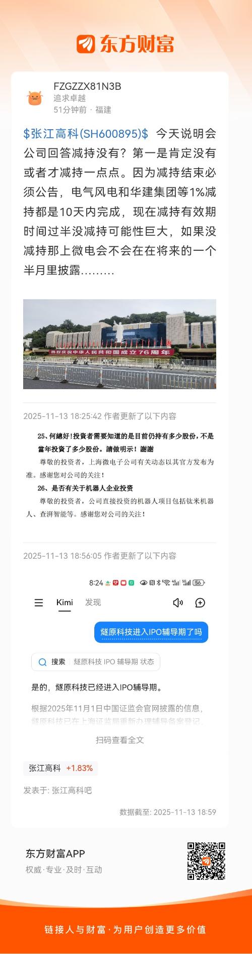 $张江高科(SH600895)$  今天说明会公司回答减持没有?第一是肯定没有或者才减持一点点。因为减持结束必须公告,电气风电和华建集团等1%减持都是10天内完成,现在减持有效期时间过半没减持可能性巨大,如果没减持那上微电会不会在在将来的一个半月里披露………