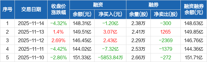 寒武纪:融资净偿还1.2亿元,融资余额148.31亿元(11-14)