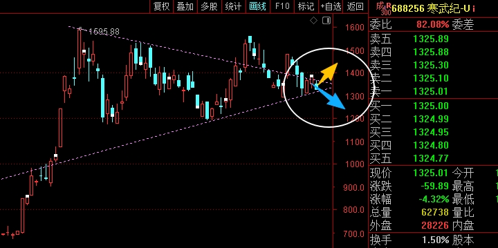 $寒武纪-U(SH688256)$ 寒王这个位置比较关键,一个三角收敛状态面临方向选择,另外就是脚底安全线1282.28位置的支撑情况,综合来看,这里能稳住继续震荡就还能观察一下,但如果选择方向,并且跌破安全线后不能快速收回来,那整体就要做破位的防守了,不用太纠结,万能站稳了,要么就是刹车跌多一些再考虑回补仓位。破位不要硬扛,控制仓位优先。#炒股日记# #周度策略#