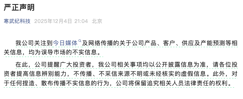 12月4日晚间,寒武纪发布严正声明称,公司关注到今日媒体及网络传播的关于公司产品、客户、供应及产能预测等相关信息,均为误导市场的不实信息。