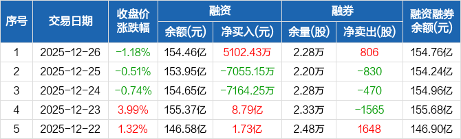 寒武纪:融资净买入5102.43万元,融资余额154.46亿元(12-26)