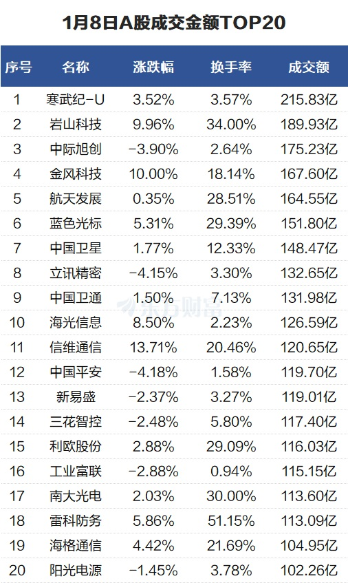 活跃个股:寒武纪成交216亿元 爱朋医疗换手率54%