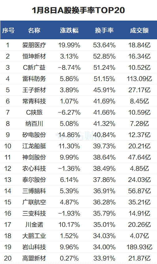 当天换手率最高的个股为爱朋医疗,全天换手率53.64%。恒坤新材紧随其后,全天换手率52.85%。
