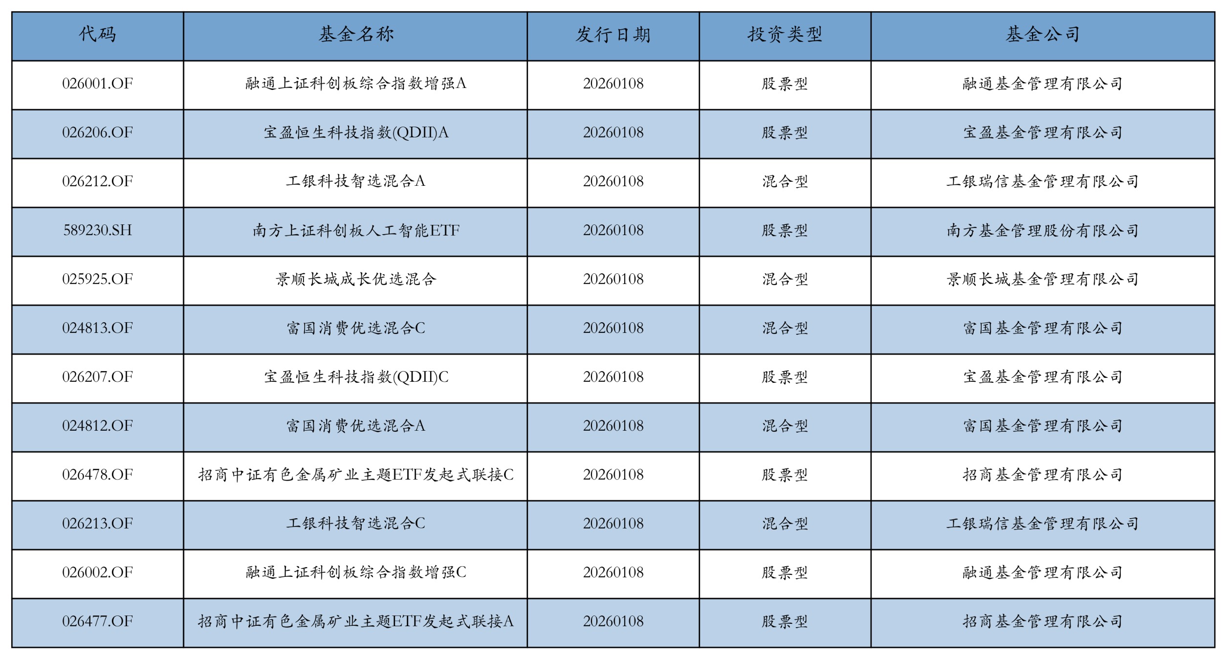 昨日有12只新基金发行,分别为:融通上证科创板综合指数增强A、宝盈恒生科技指数(QDII)A、工银科技智选混合A、南方上证科创板人工智能ETF、景顺长城成长优选混合、富国消费优选混合C、宝盈恒生科技指数(QDII)C、富国消费优选混合A、招商中证有色金属矿业主题ETF发起式联接C、工银科技智选混合C、融通上证科创板综合指数增强C、招商中证有色金属矿业主题ETF发起式联接A,详情见下表: