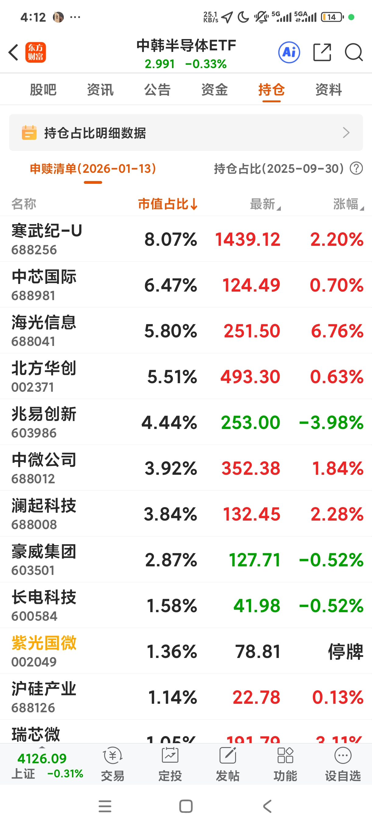 $寒武纪-U(SH688256)$ 我买了这个中航半导体ETF被套好几个点,他持仓最高的是寒王,想问一下明天半导体能继续涨么,低开的话要不要补仓,高开的话要不要跑路,小白就想赚个买菜钱,咋这么难,大佬麻烦指导一下谢谢