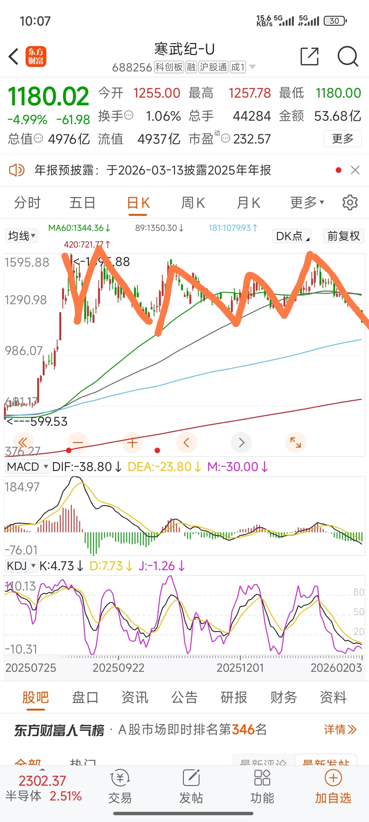 $寒武纪-U(SH688256)$ 中阴中枢,最多9笔,选择向下了