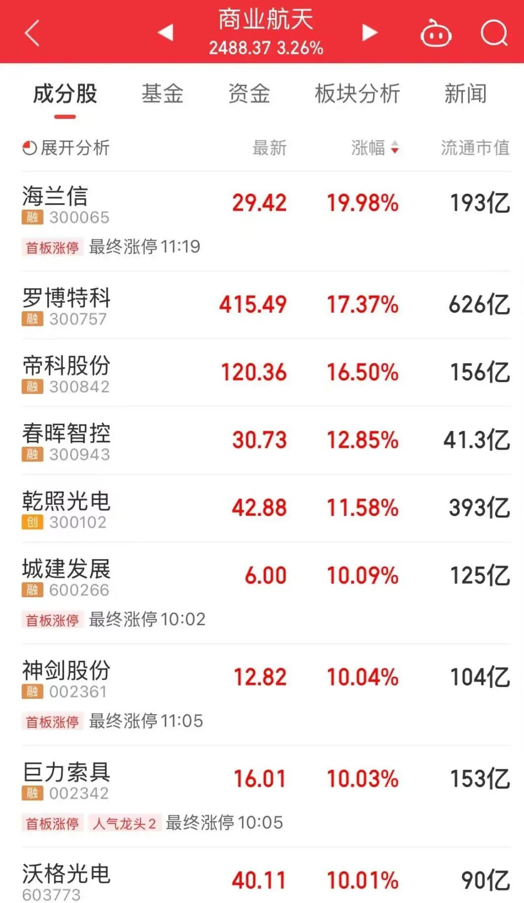 今天上午,商业航天板块上涨,海兰信、帝科股份等个股大涨。