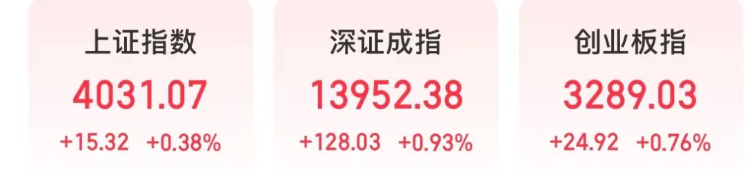 截至上午收盘,上证指数上涨0.38%,深证成指上涨0.93%,创业板指上涨0.76%。