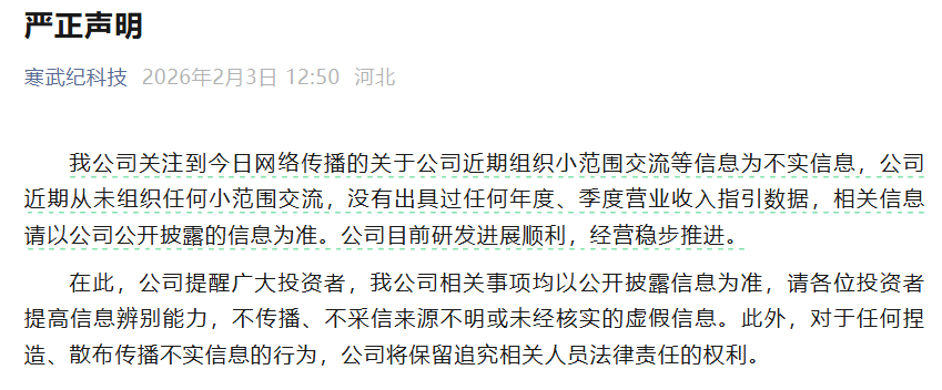 2月3日午间,寒武纪发布声明称,公司关注到今日网络传播的关于公司近期组织小范围交流等信息为不实信息,公司近期从未组织任何小范围交流,没有出具过任何年度、季度营业收入指引数据,相关信息请以公司公开披露的信息为准。公司目前研发进展顺利,经营稳步推进。