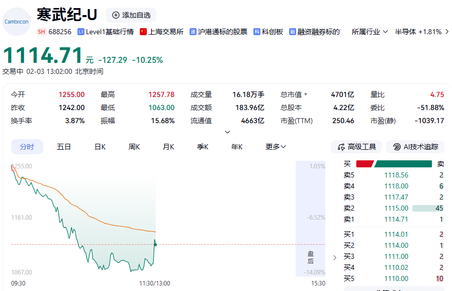 今日上午,寒武纪盘中突然跳水,跌幅一度超过14%,成交量明显放大。截至中午收盘,寒武纪跌12.88%,股价报1082.09元/股,总市值为4563亿元。