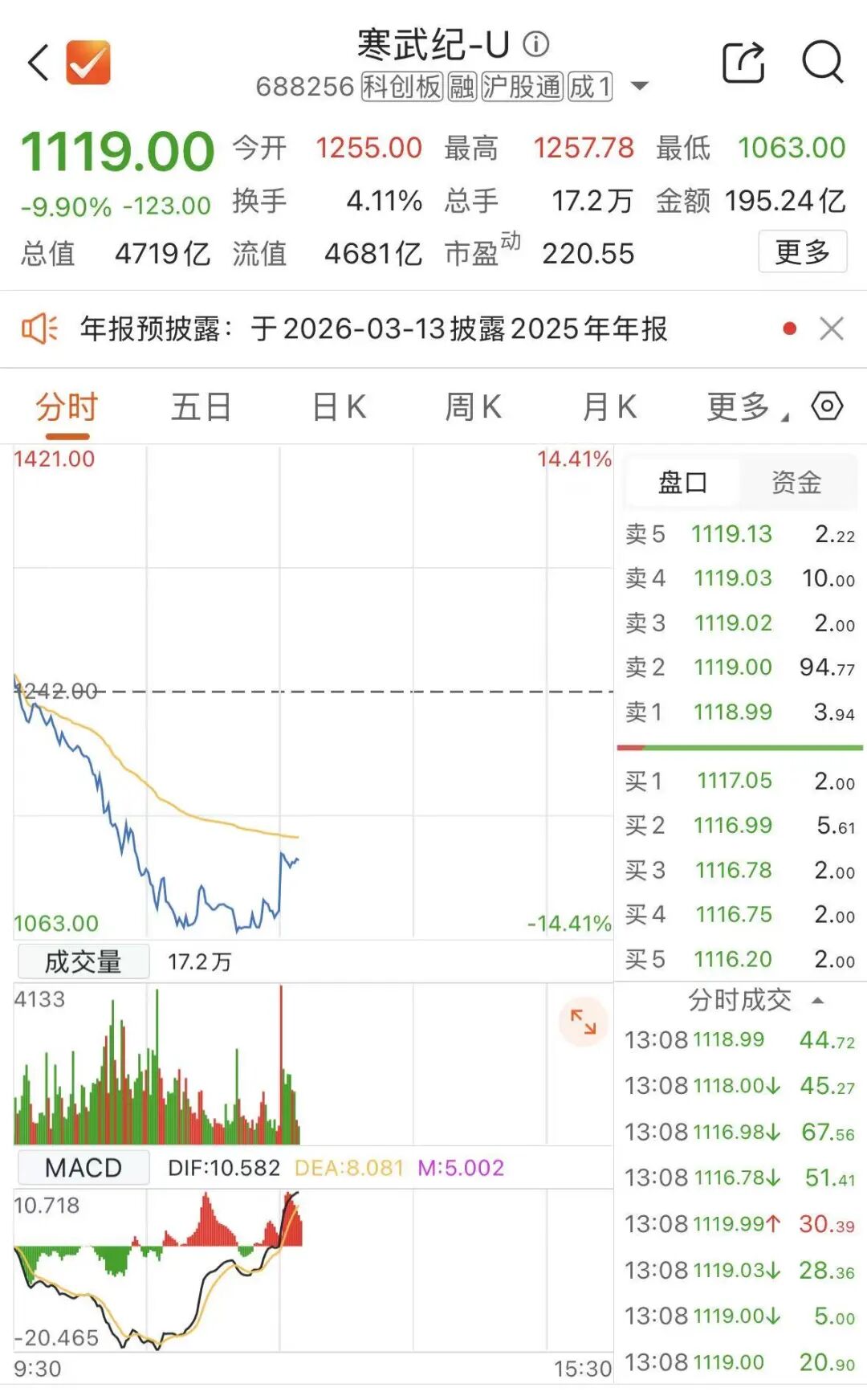 午后寒武纪股价拉升,截至发稿跌幅收窄至9.9%,股价回升至1119元/股,成交额超195亿元。