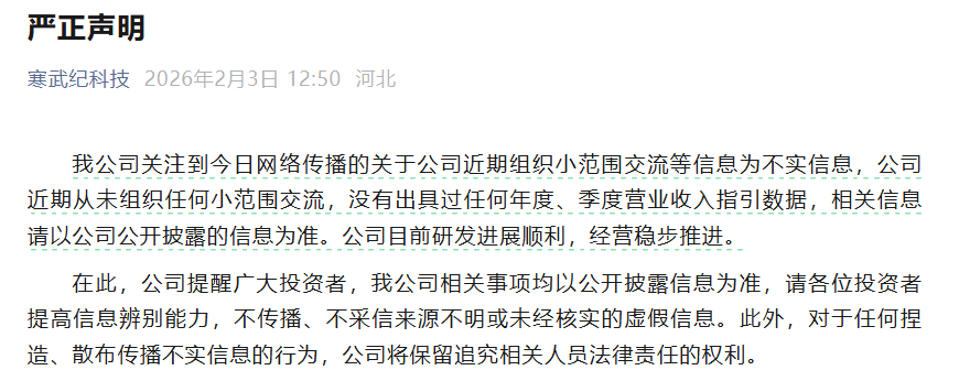 今日午间,寒武纪在其公众号“寒武纪科技”发布《严正声明》。