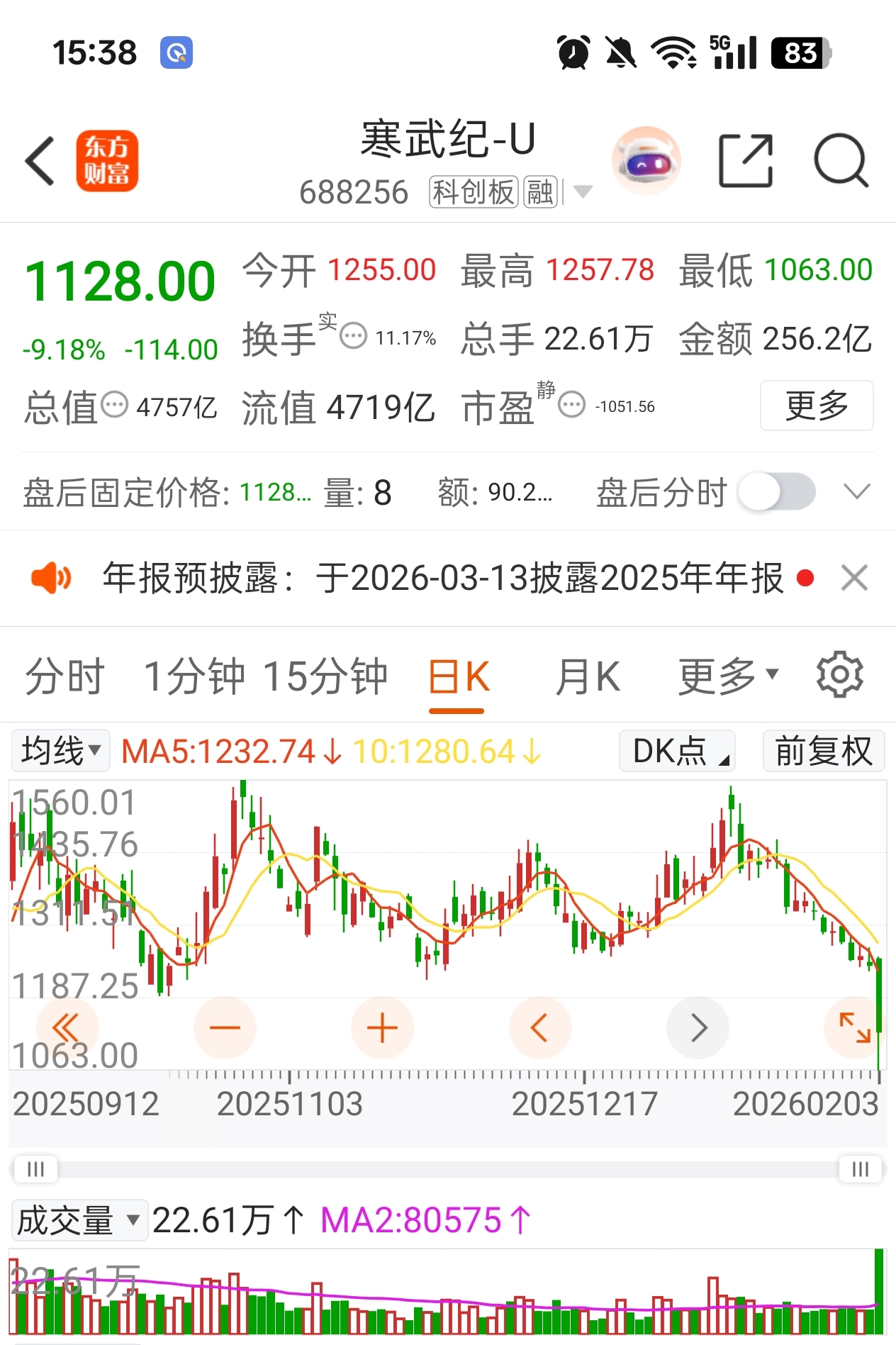 $寒武纪-U(SH688256)$ 放量下跌,全部挂山顶了…