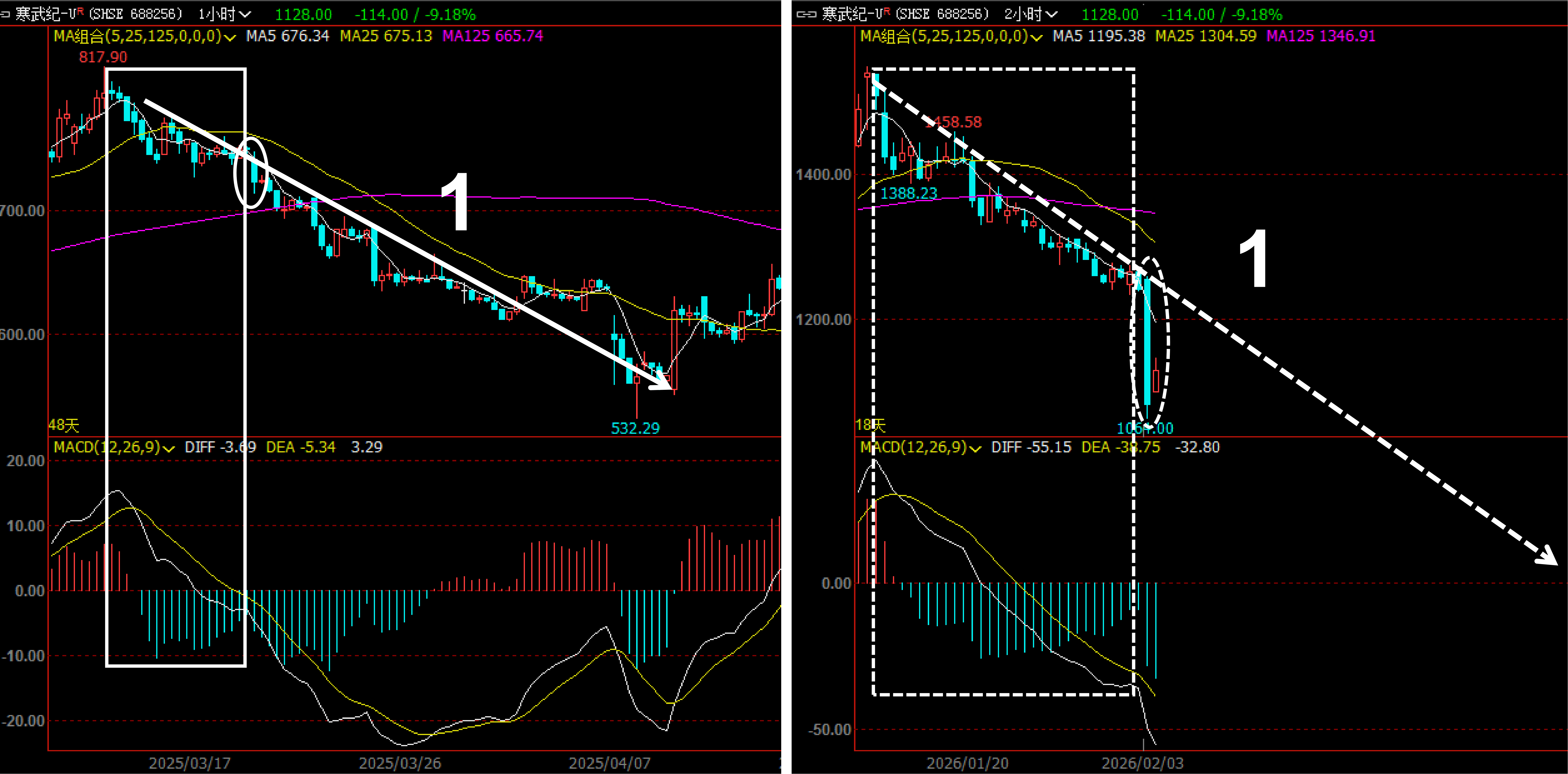 我把白色实线框框和白色虚线框框内的白色实线虚线箭头1所标注的走势结构,分别截取并放大后对照观察,以便让大家知晓目前的回调下调探底结构已经运行到那个位置了?对照观察可知,目前寒武纪的下跌,刚刚进行到白色圈圈处,白色圈圈之后,剩余的下跌结构还有好多呢。股市铁头哥,如此这次真的头铁的话,那么他的铁头非得被寒武纪的后续下跌走势给砸烂不可。