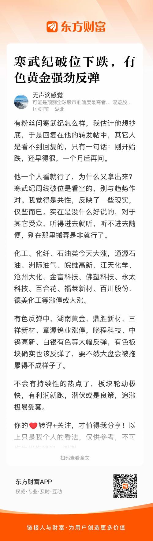 温馨提示: 1.根据《证券法》规定,禁止编造、传播虚假信息或者误导性信息,扰乱证券市场;2.用户在本社区发表的所有资料、言论等仅代表个人观点,与本网站立场无关,不对您构成任何投资建议。用户应基于自己的独立判断,自行决定证券投资并承担相应风险。《东方财富社区管理规定》