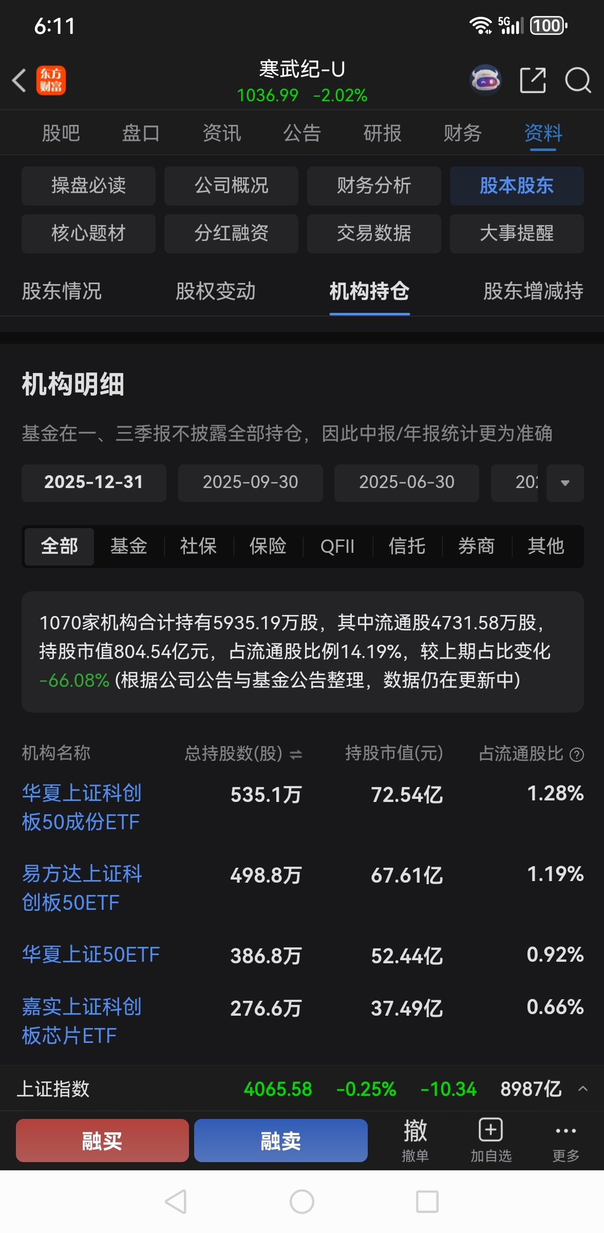 $寒武纪-U(SH688256)$ 寒武纪:爆炒过后,一地鸡毛!机构未路狂奔,小韭菜高位接盘。机构投资者所持流通股比例由2025年三季度的41.82%,下降到年末的14.18%,减持了其中三分之二的筹码。股东人数则由2025年6月末的4.08万人户增加到2026年2月6日的6.2万户。机构都跑了,小韭菜都套在上面,怎么涨?