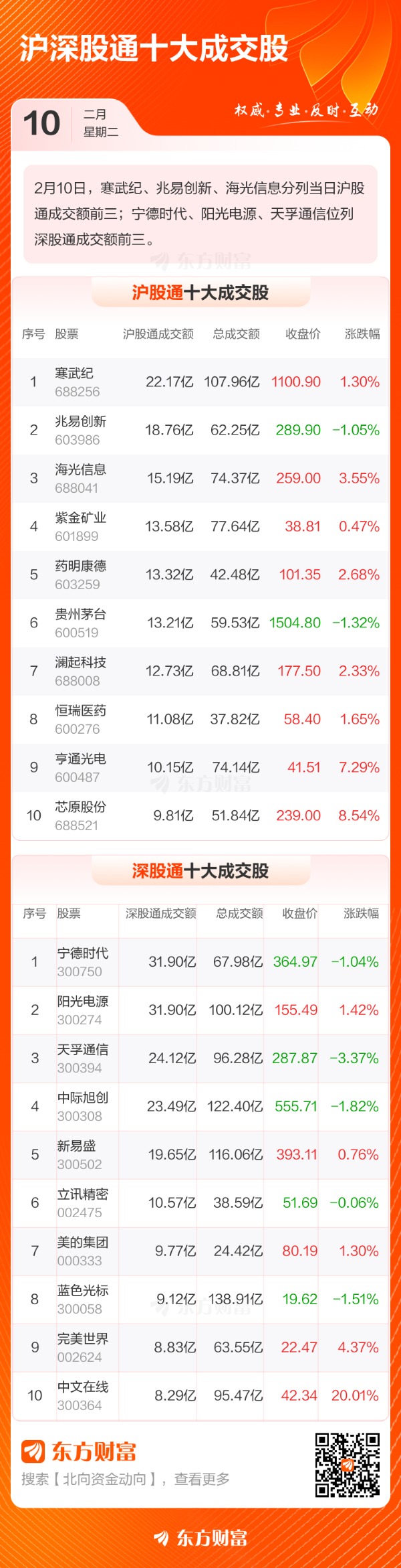 寒武纪、兆易创新、海光信息位列沪股通成交前三,成交额分别为22.17亿、18.76亿、15.19亿;宁德时代、阳光电源、天孚通信位列深股通成交前三,成交额分别为31.90亿、31.90亿、24.12亿。