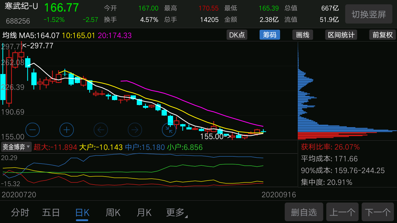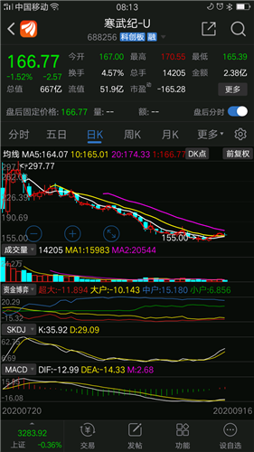 从整个k 线图看,寒武纪下跌过程一路阴跌,下跌不干脆,那么投资者也是一路被套,说明关注的投资者比较多,关注人太多,反而不利于止跌,涨起来也容易犹犹豫豫……