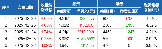 新锐股份:融资净偿还132.44万元,融资余额4.31亿元(12-26)