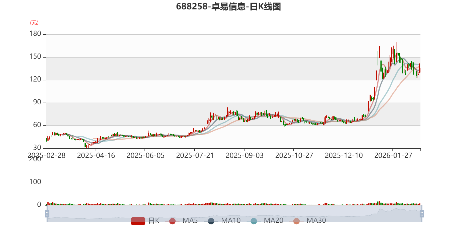 中证智能财讯卓易信息(688258)2月27日晚间披露2025年业绩快报,公司实现营业收入3.38亿元,同比增长4.42%;归母净利润8212.16万元,同比增长150.05%;扣非净利润4424.36万元,同比增长197.07%;基本每股收益0.68元,加权平均净资产收益率为9.36%。以2月27日收盘价计算,卓易信息目前市盈率(TTM)约为199.44倍,市净率(LF)约18.97倍,市销率(TTM)约47.76倍。